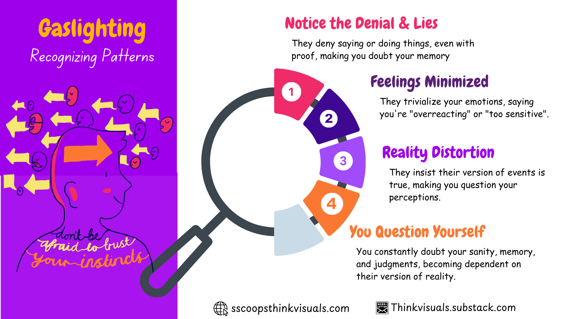 It therefore helps to recognize certain patterns in your interaction with people. Here is my visual summary that can set you thinking and act as a good starting point to identify gaslighting.